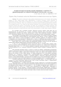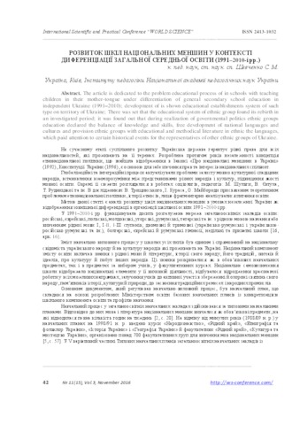- Шевченко, Світлана Миколаївна (2016) Development of schools of national minorities in the context of differentiation of general secondary education (1991-2010) Materials of the III International Scientific and Practical Conference "Modern scientific achievements and their practical application", 11 (15). pp. 42-46. ISSN 2413-1032