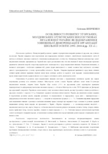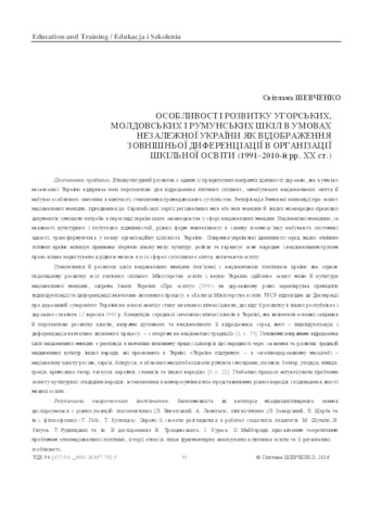 - Шевченко, Світлана Миколаївна (2016) Features of the development of Hungarian, Moldovan and Romanian schools in the context of independent Ukraine as a reflection of external differentiation in the organization of school councils (1991-20101991-2010-ies. XX century) Bologna process and prospects for the development of higher education in Ukraine, Europe and the world: Sat. mater. HI International. scientific and prak. Conf. 24-26 Nov. 2016 (2). pp. 91-105. ISSN 2413-9025, 2450-6486