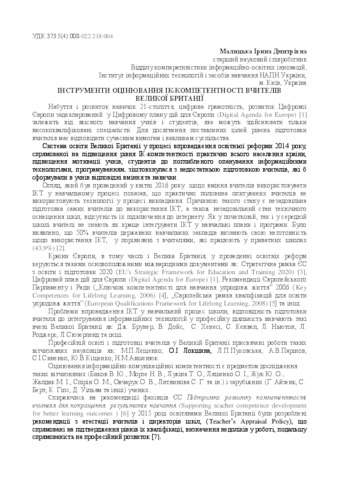 - Малицька, І.Д. (2017) Instruments of teachers' IC-competency assessment in Great Britain In: Звітна наукова конференція Інституту інформаційних технологій і засобів навчання НАПН України 2017 року . Інститут інфоррмаційних технологій і засобів навчання НАПН України.