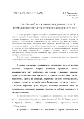 - Маршицька, В.В. (orcid.org/0000-0002-7072-8844) and Васильєва, С.А. (2016) Ukrainian dimension of education for democratic citizenship in preschool children. Теоретико-методичні проблеми виховання дітей та учнівської молоді, 1 (20). pp. 306-317. ISSN 2308-3778