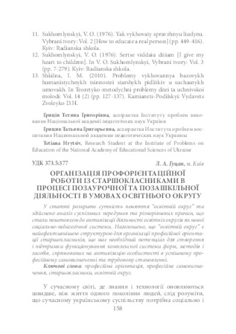 - Гуцан, Л.А. (2017) Organization of Professional Orientation Work with Senior Pupils in the Process of Extra-Curricular and Out-of-School Activities in the Educational District Теоретико-методичні проблеми виховання дітей та учнівської молоді, 1 (21). pp. 158-168. ISSN 2308-3778, online 2411-0361