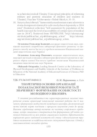 - Пархоменко, О.М. (2017) Theoretical Basеs of Organization of Out-of-Class Educational Work and Its Significance in the Formation of the Personality of Primary School Student Теоретико-методичні проблеми виховання дітей та учнівської молоді, 2 (21). pp. 135-146. ISSN 2308-3778, online 2411-0361