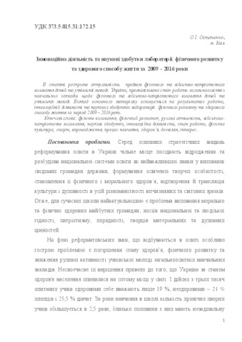 - Остапенко, О.І. (2017) Innovative activity and scientific achievements of laboratory of physical development and healthy way of life is for 2009 – 2016 Теоретико-методичні проблеми виховання дітей та учнівської молоді, 2 (21). pp. 124-135. ISSN 2308-3778