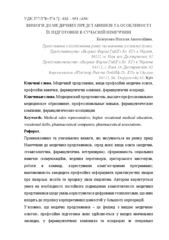 - Білоусова, Наталя Анатоліївна (orcid.org/0000-0001-6732-426X) (2017) Requirements for medical sales representatives and features of their education in modern Germany Науковий вісник інституту професійно-технічної освіти НАПН України, 14. pp. 146-152. ISSN 2223-5752