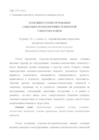 The article is devoted to theoretical and methodological analysis of the basic scientific approaches to the design of social and psychological technologies in order to minimize the manifestations of polarization in the space of education. The basic characteristics of socio-psychological technology are explained: clarity, flexibility, reliability, efficiency, innovation, polarity, convenience, attractiveness of its result, harmony, humanism, efficiency. The criteria of classification of socio-psychological technologies in the educational environment, which according to the totality of social actions are divided into focused, stabilizing, adaptive and integrative and by the level of their realization on meta-, macro-, meso- and micro-technology. The specifics of socio-psychological and pedagogical technologies of inter-entity communicative interaction in educational environment are determined.
