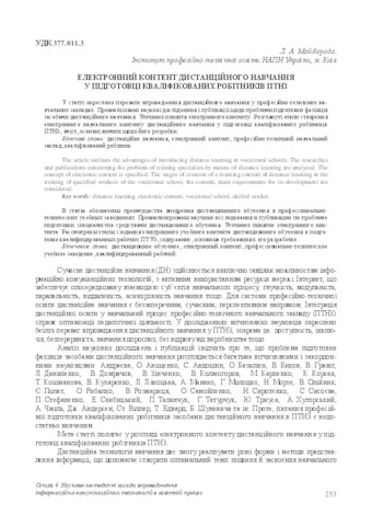 - Майборода, Людмила Анатоліївна (2017) Electronic content of distance learning in the training of skilled workers at vocational schools In: Інформаційно-комунікаційні технології в сучасній освіті: досвід, проблеми, перспективи (5). ЛДУ БЖД, м. Львів, Україна, pp. 253-255. ISBN ISSN 2411-4685
