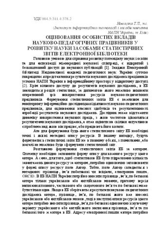 - Новицька, Т.Л. (orcid.org/0000-0003-2591-5218) (2017) Assessment of personal contributions of scientific and pedagogical workers in the development of science by means of statistical reports of the Digital Library In: Науково-практична конференція «Мультимедійні технології в освіті та інших сферах діяльності» . НАУ.