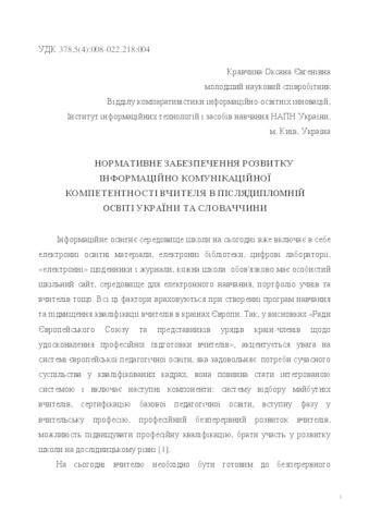 - Кравчина, О.Є. (2017) Regulatory provision of the development of informational and communication competence of the teacher in postgraduate education in Ukraine and Slovakia In: Звітна наукова конференція Інституту інформаційних технологій і засобів навчання НАПН України: Збірник матеріалів наукової конференції. . ІІТЗН НАПН України, м. Київ, Україна, pp. 160-164.