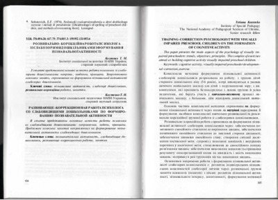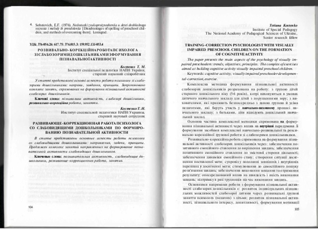 - Костенко, Т.М. (orcid.org/0000-0002-4976-1236) (2014) Training-correction psychologist with visually impaired preschool children on the formation of cognitive activity Дитина із сенсорними порушеннями:розвиток, навчання, виховання (5). pp. 104-133. ISSN 2313-4542