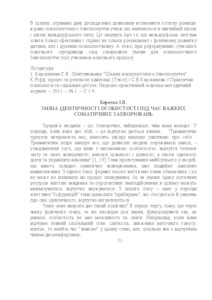 - Березко, Іванна Василівна (2017) Change in identity of a person in severe physical illnesses In: Ракурси психологічного благополуччя особистості: збірник тез доповідей всеукраїнського науково-практичного семінару "Ракурси психологічного благополуччя особистості", 9 червня 2017 р., Ніжин . НДУ ім. М.Гоголя, м. Ніжин, Україна, pp. 31-36.