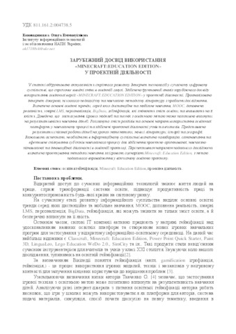 - Коневщинська, О.Е. (orcid.org/0000-0003-4125-8764) (2017) Foreign experience of the use of "Minecraft:Education Edition" in project activity Інформаційні технології в освіті, 32. pp. 86-98. ISSN 1998-6939