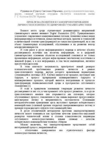 - Рудницька, Світлана Юріївна (2017) The problem of personal development and self-designing in the context of digital humanitaristics In: Віртуальний освітній простір: психологічні проблеми: матеріали V Міжнародної науково-практичної Інтернет-конференції . Інститут психології імені Г.С. Костюка НАПН України, м. Київ, Україна.