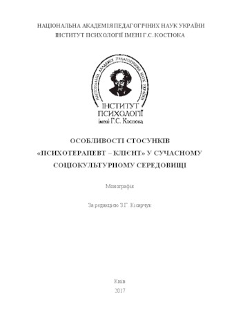 The collective monograph, that was prepared by the scientists of the laboratory of consulting psychology and psychotherapy of the G.S. Kostiuk Institute of Psychology of the National Academy of Educational Sciences of Ukraine, is devoted to consideration of the specificies of the "therapist-client" relationships in the context of psychological assistance to victims of severe traumatic events. The monograph presents: the results of the theoretical and methodological analysis of the such scientific problem as relationship "psychotherapist-client" in crisis socio-cultural conditions; clarifying the specifics of constructing psychotherapeutic relations with such categories of victims as internally displaced persons (adults and children), soldiers who have suffered physical injuries, and other veterans who are receive rehabilitation, and members of their families; research results of the specifics of emotional conditions of volunteer psychologists / therapists worked with trauma victims; clarifying the specifics of communication between the psychologist and the population through printed mass media in crisis situations. The monograph is meant for psychologists - scientists and practitioners, teachers of higher educational institutions, and specialists from other " helping" professions and volunteers - all who are busy in the field of psychological and socio-psychological assistance to victims of severe traumatic events.