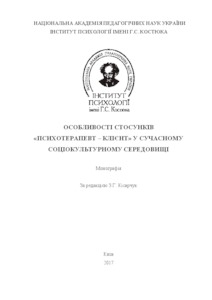 - Кісарчук, Зоя Григорівна (orcid.org/0000-0002-4461-945X), Омельченко, Яніна Миколаївна (orcid.org/0000-0002-3012-2258), Лазос, Гелена Петрівна (orcid.org/0000-0002-8935-2664), Гурлєва, Т.С. (orcid.org/0000-0002-6518-5216), Гребінь, Л.О., Журавльова, Н.Ю. (orcid.org/0000-0002-3575-9776), Литвиненко, Людмила Іванівна, Плескач, Б.В. (orcid.org/0000-0002-2215-6810) and Уркаєв, В.С. (orcid.org/0000-0002-2414-7977) (2017) Peculiarities of «psychotherapist-client» relationship in modern socio-cultural conditions: monograph Project Report. Видавничий Дім «Слово», м. Київ, Україна.