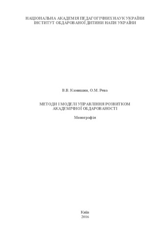 - Камишин, Володимир Вікторович and Рева, Олексій Миколайович (orcid.org/0000-0002-5954-290X) (2016) Methods and models of management of the development of academic giftedness Project Report. Інститут обдарованої дитини НАПН України, м. Київ, Україна. (Unpublished)