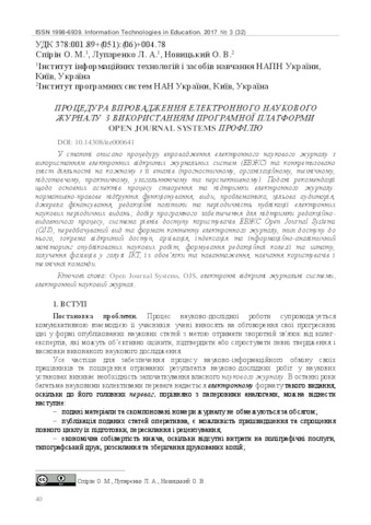 - Спірін, О.М. (orcid.org/0000-0002-9594-6602), Лупаренко, Л. А. (orcid.org/0000-0002-4500-3155) and Новицький, О.В. (2017) The procedure of implementation of electronic scientific journal using the Open Journal Systems software platform Інформаційні технології в освіті, 3 (32). ISSN 2306-1707