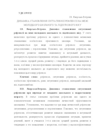 - Яворська-Вєтрова, Ірина Вікторівна (2016) Dynamics of situational reflection formation on the verge of primary school age and adolescence Актуальні проблеми психології: збірник наукових праць Інституту психології імені Г.С. Костюка НАПН України. - Том 4. Психологія розвитку дошкільника, 12. pp. 254-262. ISSN 2072-4772