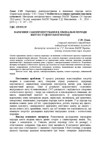 - Гуцол, С.Ю. (2016) Narrative self-design in the liminal periods of student youth life Особистість в умовах кризових викликів сучасності: Матеріали методологічного семінару НАПН України (24 березня 2016 року). pp. 247-255.