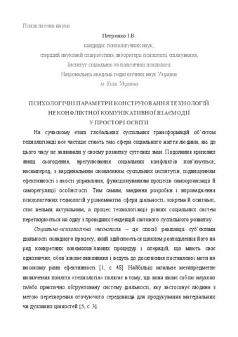 - Петренко, Ірина Володимірівна (orcid.org/0000-0002-5900-0852) (2017) Psychological parameters of constructing technologies of non-conflict communicative interaction in the educational space «UChoice: 4P» Ukrainian Choice: Public Policy, Politics, Psychologyy: матер. Третьої міждисципл. наук-практ. конфер. (м. Одеса, 6 жовтня 2017 р.). pp. 75-78. ISSN 2413-1261