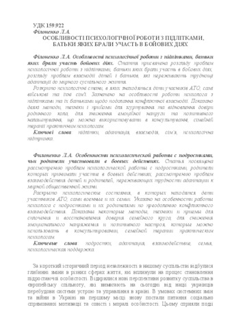 - Філоненко, Л.А. (2017) Psychological work with adolescents whose parents took part in combat actions Актуальні проблеми психології, 15 (11). pp. 553-560. ISSN 2072-4772