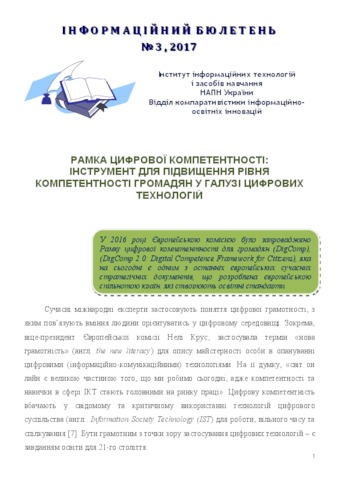 - Овчарук, О.В. (2017) Digital Competence Framework: the instrument for the development of the level of citizens' digital competence in the sphere of digital technologies. Informational digest № 3 - 2017 ІІТЗН НАПН України, м. Київ, Україна. (Submitted)