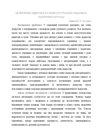 - Зливков, В.Л. (2016) Authentic leadership in the context of the current socio-political situation Наукові студії із соціальної та політичної психології, 38 (41). pp. 111-123.