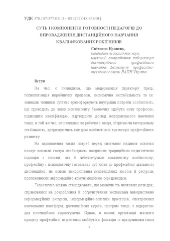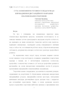 - Кравець, С.Г. (orcid.org/0000-0001-6259-0067) (2016) Essence and components of readiness vocation school teachers for the introduction of distance education for skilled workers Науковий вісник Інституту професійно-технічної освіти НАПН України. Професійна педагогіка (12). pp. 88-97. ISSN 2223-5752