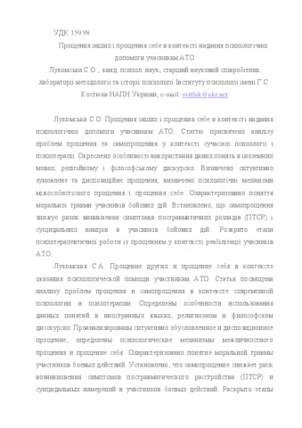 - Лукомська, Світлана Олексіївна (2017) Forgive others and forgive oneself in the context of providing psychological assistance to ATO participants Актуальні проблеми психології. - Том XI. Психологія особистості. Психологічна допомога особистості., 15. pp. 28-39. ISSN 2072-4772