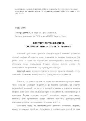 - Завгородня, О.В. (2016) Mental health of the person: sociocultural and subject factors Мова і культура, 19 (181). pp. 62-69.