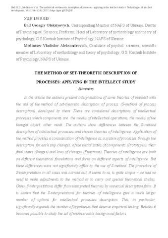 - Medintsev, Vladislav Aleksandrovich and Ball, Georgiy Oleksiyovych (2017) Тhe method of set-theoretic description of processes: applying in the intellect study Technologies of intellect development, 2 (5 (16)). ISSN 2223-0521