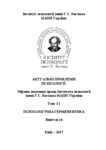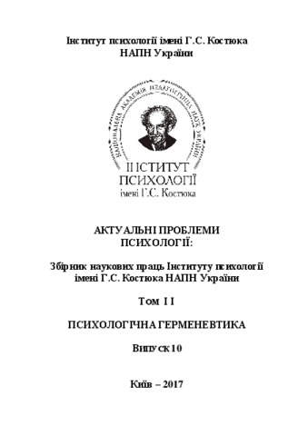 Чепелєва, Н.В., Рудницька, Світлана Юріївна, Зазимко, О.В., Березко, Іванна Василівна, Зарецька, О.О., Лебединська, Ірина Вадимівна, Шиловська, О.М., Гудінова, І.Л., Кресан, Ольга Дмитрівна, Коваленко-Кобилянська, Ірина Генріхівна, Мещеряков, Дмитро Сергійович, Галунзовский, Ілля Сергійович, Гуцол, Кирил Віталійович and Колярова, Анастасія Олегівна (2017) Actual problems of psychology: Vol.2 Psychological hermeneutics Актуальні проблеми психології (10). Вид-во Житомирського державного університету ім. І. Франка, м. Київ, Україна - м. Житомир, Україна.