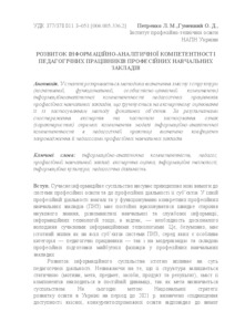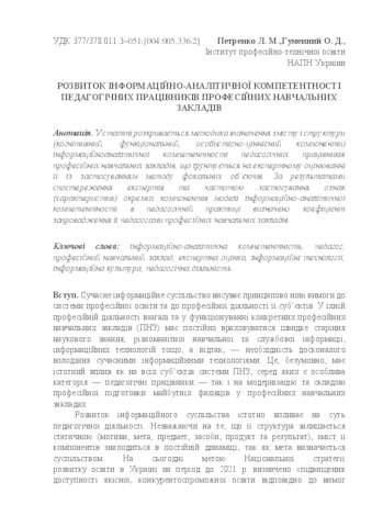 - Гуменний, О.Д. (orcid.org/0000-0001-6596-3551) and Петренко, Лариса Михайлівна (2017) Development of informational and analytical competence of pedagogical workers of professional educational institutions Наукове забезпечення розвитку освіти в Україні: актуальні проблеми теорії і практики. pp. 320-328.