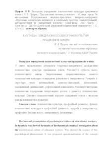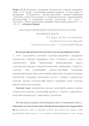 - Пророк, Н.В. (2017) The internal prerequisites of psychological culture of educational workers Перспективні питання психології: зб. наук. праць. За матеріалами Всеукраїнської науково-практичної Інтернет-конференції «Проблема особистісної активності в освітньому просторі: концептуальний, методологічний та емпіричний аспекти» [Слов’янськ, 2017 року]. pp. 124-132.
