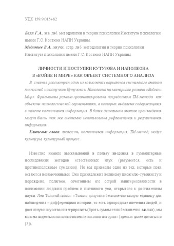 - Балл, Георгій Олексійович and Мєдінцев, Владислав Олександрович (orcid.org/0000-0002-5171-0139) (2016) Рersonalities and actions of Kutuzov and Napoleon in "War and Peace" as objects of systemic analysis Мова і культура, 1 (19). pp. 56-62.