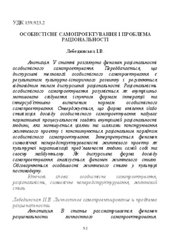 - Лебединська, Ірина Вадимівна (2017) Personal self-designing and problem of the rationality Актуальні проблеми психології : Т..2 : Психологічна герменевтика (10). pp. 52-63. ISSN 2072-4772