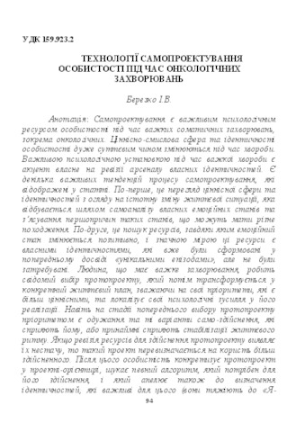 - Березко, Іванна Василівна (2017) Technologies of persons self-designing during oncological diseases Актуальні проблеми психології: Т.2 Психологічна герменевтика (10). pp. 94-108. ISSN 2072-4772