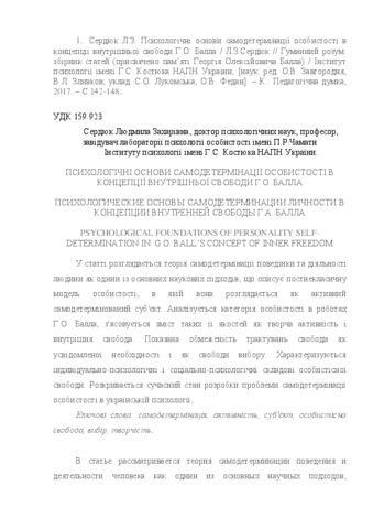 - Сердюк, Л.З. (2017) Psychological foundations of personality self-determination in G.O. Ball’s concept of inner freedom Гуманний розум: збірник статей (присвячено пам’яті Георгія Олексійовича Балла). pp. 142-148.