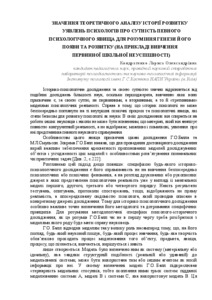 - Кондратенко, Лариса Олександрівна (2017) The significance of theoretical analysis of the history of the development of the psychologists views on the essence of a particular psychological phenomenon to understand the genesis of its appearance and development (for example, the study of primary sc Перспективні питання психології: За матеріалами Всеукраїнської науково-практичної Інтернет-конференції "Проблема особистісної активності в освітньому просторі:концептуальний, методологічний та емпіричний аспекти" (3).