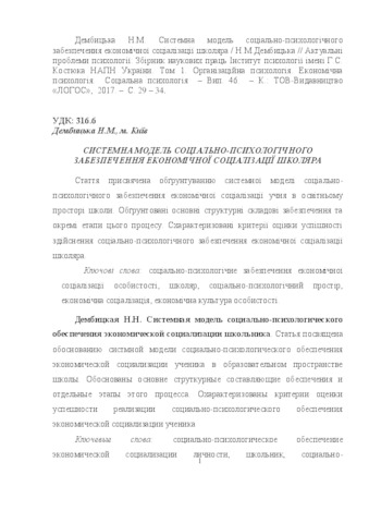- Дембицька, Н.М. (orcid.org/0000-0001-6978-7655) (2017) System model of social and psychological support for student economic socialization Актуальні проблеми психології. Том 1. Організаційна психологія. Економічна психологія. Соціальна психологія, 46. pp. 29-34. ISSN 2072-4772