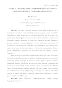 - Polonska, T.K. (orcid.org/0000-0002-5717-1041) (2017) Games as a technique for competence-oriented foreign languages teaching to primary school pupils Український педагогічний журнал, 3. pp. 109-115. ISSN 2411-7420