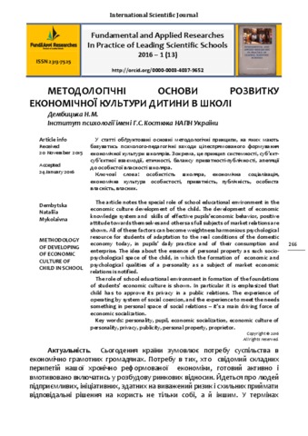 - Дембицька, Н.М. (2016) Methodology of developing of economic culture of child in school Fundamental and applied researches in practice of leading scientific schools, 1 (13). pp. 266-274. ISSN 2313-7525