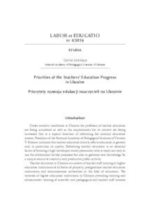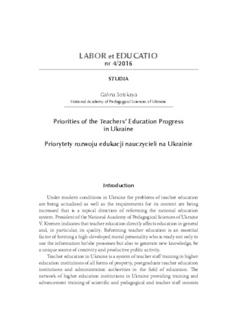- Sotskaya, Galina (orcid.org/0000-0002-0184-2715) (2016) Priorities of the Teachers’ Education Progress in Ukraine Labor et Educatio, 4 (4). pp. 121-130. ISSN 2353-4745