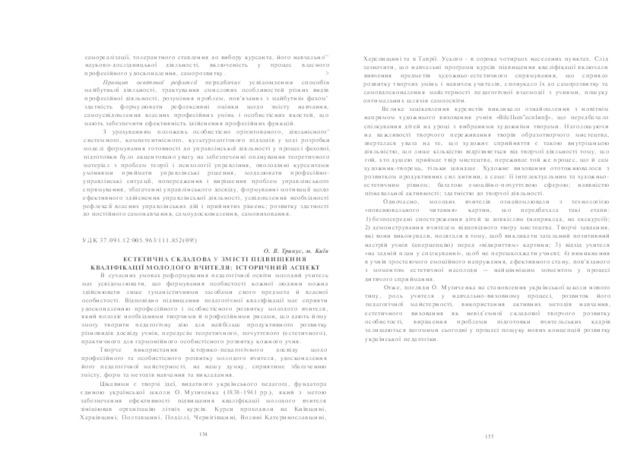 - Тринус, О.В. (orcid.org/0000-0003-2945-0796) (2017) Aesthetic component in the content of the qualification of a young teacher: the historical aspect Pedagogical mastery as a system of professional and artistic competencies, 8 (12). pp. 154-156.