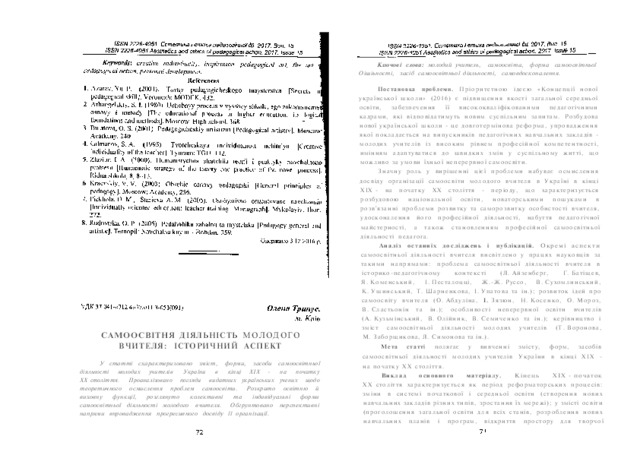 This article researches the problem of self-education organization by young teacher of Ukraine in the end of XIX - beginning of XX century, this period is characterized by the development of national education, finding innovative aspects in solving problems of teachers' development and self-identity, improving their own career, gaining the pedagogical mastery, formation of teacher professional selfeducation. It has been determined that organizing factor of pedagogical self-education was a non-compliance of coordination between the state needs to provide Ukrainian folk school by quality pedagogical trained personnel and insufficient training of graduates of educational institutions. The views of famous scientists and educators (M. Vahner, R. Viler, F. Helbke, V. Ivanovskiy, O. Muzychenko, I. Ohienko, Y. Chepiga) of the study period (including - some unknown ones in scientific circles) on the nature of young teacher self education activity, leading its study forms and tools have been analyzed Based on analysis of scientific studies it has been found that self-education of young teacher has two main functions - education (as a tool to overcome the shortcomings of professional training, acquisition of professional experience) and educational (the spiritual development of the individual, selfimprovement, knowledge, worldview, that dependent on reflection of the state professional development and improvement). It has been determined that the most successful self-education forms of young teacher are collective and individual ones, namely: reading, observation, consultation, lectures, exchange of experiences, mutual communication etc. Self-education organization is characterized by time of all educational congresses: visiting educational museums; temporary educational courses studying for teacher training and Ukrainian Pedagogical Academy; attending the young teacher school meetings and school teachers' council. The effective products of self-education of young teacher have been characterized. For example: monographs, textbooks and manuals of leading Ukrainian and foreign educators; foreign and comparative educational researches; annual training edition, lectures on psychopedagogical subjects; mobile educational exhibitions. Summarizing conclusions on perspective areas of implementation progressive experience of young teachers selfeducation on study period have been made, including the use of scientific and methodological potential scientists of the National Academy of Pedagogical Sciences of Ukraine.