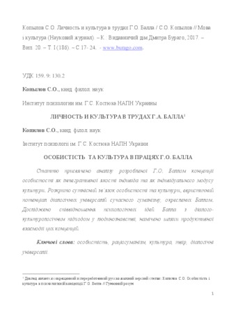 - Копилов, Сергій Олегович (2017) Personality and culture in works of G.O.Ball Мова і культура, 1 (20). pp. 17-24.