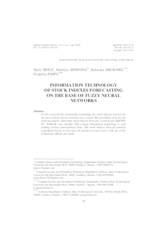 - Trius, Y.V., Zhuravel, Kateryna, Antipova, Nataliya and Zaspa, Grygoriy (2017) Information technology of stock indexes forecasting on the base of fuzzy neural networks In: Теорія і практика використання інформаційних технологій в навчальному процесі: матеріали Всеукраїнської науково-практичної конференції . НПУ імені М.П. Драгоманова, м. Київ, Україна, pp. 128-130.