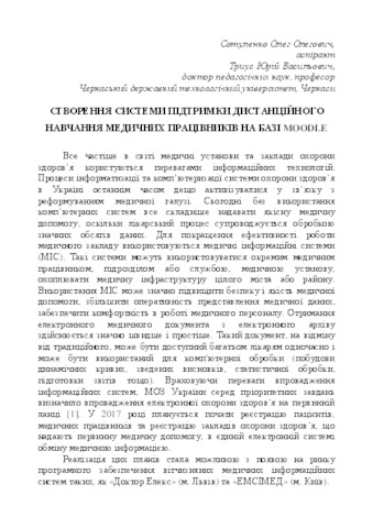 - Триус, Ю.В. and Сотуленко, О.О. (2017) Creating a Moodle based distance education support system for healthcare professionals In: Автоматизація та комп’ютерно-інтегровані технології у виробництві та освіті: стан, досягнення, перспективи розвитку: матеріали Всеукр. наук.-практ. Інтернет-конф. (АКІТ-2017) . ЧНУ ім. Б. Хмельницького, м.Черкаси, Україна, pp. 259-261.