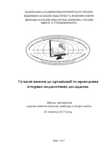 The collection contains materials summarizing the scientific reports of participants of the scientific and methodological seminar on the history of education "Modern requirements for the organization and conduct of historical and pedagogical research", held in the V. O. Sukhomlynskyi State Scientific and Pedagogical Library of Ukraine on October 25, 2017.