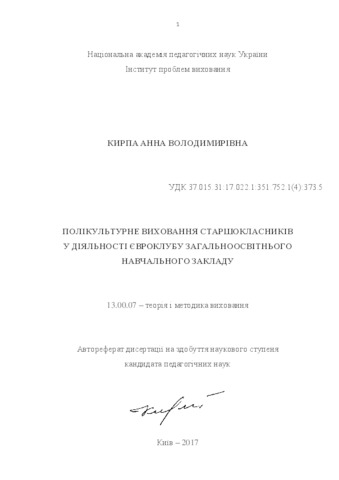 The thesis is devoted to the problem of multicultural education of senior students in Euroclubs of comprehensive secondary educational institution. Based on the analysis of national and foreign scientific, psychological and pedagogical literature, the research reveals the essence of multicultural education within Euroclub activity as the process of social and cultural identification of a person in a multicultural society, which is created and functions in the secondary educational establishment in order to recognize cultural diversity by senior students and develop a tolerant attitude towards cultural differences and ability to cooperate effectively with representatives of various cultural groups, ability to generate creative solutions to unusual situations while intercultural interacting (overcoming conflicts, working within a limited period of time or with a new team etc.).