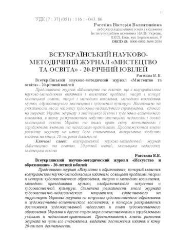 - Рагозіна, Вікторія Валентинівна (orcid.org/0000-0002-3694-2054) (2017) National education theory journal "Art and Education" - 20th anniversary Музичне мистецтво в освітологічному дискурсі, 2 (2). pp. 51-54. ISSN 2518-766Х